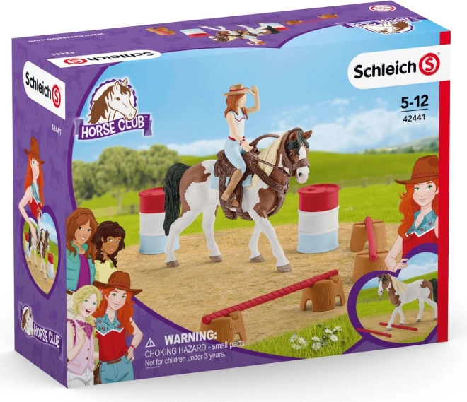 Das Western-Reitset Hannah bringt die Atmosphäre von Barrel-Racing-Wettbewerben ins Kinderzimmer. Das Set bietet bunte Fässer und niedrige Hindernisse, die frei platziert werden können – so erstellt das Kind ganz einfach seine eigene Reitstrecke. Dank abnehmbarem Sattel und Zaumzeug kann Hannah das Pferd für Training und Wettkampf vorbereiten.