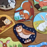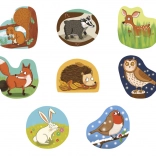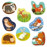 Die Puzzles enthalten Illustrationen von verschiedenen Waldtieren, wie Dachs, Reh, Fuchs und vielen mehr.