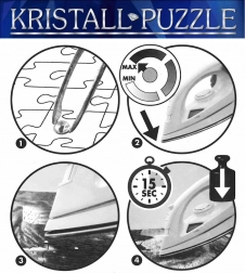 Nach dem Zusammenbauen können Sie das Motiv (Kleber ist nicht im Paket enthalten) nach der beigefügten Anleitung mit einem Bügeleisen fixieren und Kristalle anbringen. Die Abmessungen des zusammengebauten Puzzles sind ca. 44 x 68 cm.