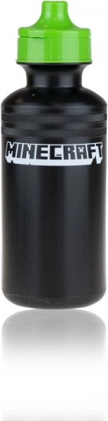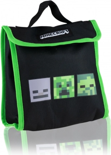 Snackbeutel 18,5 × 11 × 20 cm mit Klettverschluss und Kunststoffflasche mit 500 ml Volumen (20 × 6,5 cm) – alles im einheitlichen MINECRAFT-Stil.