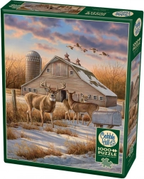Entdecken Sie den Zauber einer winterlichen Landschaft mit Hirschen, einer Scheune und fliegenden Gänsen – die detailreiche Illustration ergibt ein eindrucksvolles Motiv, das Natur- und Landlebensliebhaber begeistern wird. COBBLE HILL Puzzles sind bekannt für ihre präzise Qualität und die einzigartige Stanzung, die ein unverwechselbares Puzzle-Erlebnis bietet.