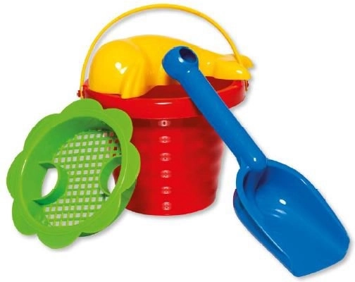 Das Set umfasst einen Eimer mit einer Höhe von 11 cm, eine Schaufel, eine Form und ein Sieb – die Grundausstattung zum Burgenbauen, Formen und Transportieren von Sand. Die Farbgestaltung kann variieren, wodurch jedes Set zu einem einzigartigen Stück wird.