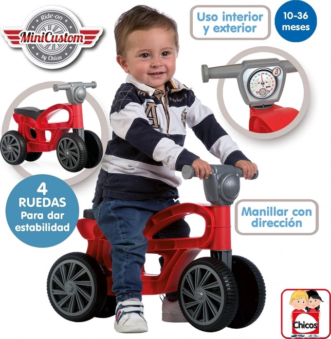 Das rote Kinder-Rutschfahrzeug Mini Custom fördert die natürliche Entwicklung von Motorik und Gleichgewicht und bietet gleichzeitig viel Spaß zu Hause und im Garten. Dank der kompakten Maße 54 × 22,5 × 38 cm und der Sitzhöhe von 27 cm können Kinder leicht abstoßen und sicher auf- und absteigen.