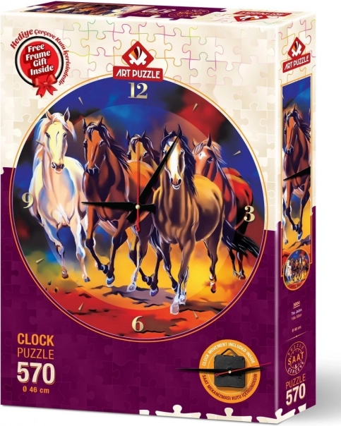 Die Montage ist einfach: Nach dem Verkleben des Puzzles auf die beiliegende Unterlage setzen Sie den Rahmen zusammen, legen das Motiv ein, befestigen die Clips und setzen das Uhrwerk auf. Das Ergebnis ist eine dekorative Uhr mit einem Durchmesser von ca. 46 cm, die Pferdeliebhaber und Puzzle-Fans gleichermaßen begeistert.