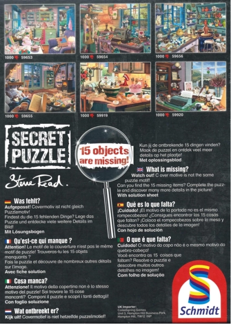 Bringen Sie Ihre Konzentration und detektivischen Fähigkeiten mit dem Puzzle Secret Kollektion von Schmidt an die Grenzen. Dieses einzigartige Puzzle bietet 15 Unterschiede, die Sie nur beim Zusammensetzen entdecken können. Was Sie auf der Schachtel sehen, ist nicht das, was Sie auf dem Tisch erhalten. Es ist Zeit, jedes Teil zu erforschen und die versteckte Wahrheit aufzudecken!