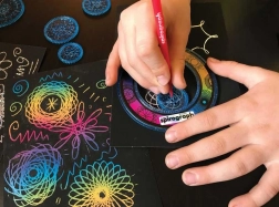Kreatives Spirograph-Set, mit dem Sie unzählige, farbenfrohe Mandalas gestalten können. Im Set Scratch&Shimmer werden die Mandalas mit einem Kunststoff-Gravierstift herausgekratzt. Wählen Sie einfach zwischen Regenbogen- und Glitzerpapier. Der Packungsinhalt umfasst: