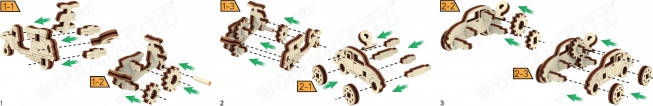 Dank der hochwertigen Birken-Sperrholzplatten und der Montage ohne Klebstoff oder Werkzeuge ist der Zusammenbau dieser Modelle nicht nur umweltfreundlich, sondern auch für jeden zugänglich. Pro Modell genügen 10 Minuten, und Sie genießen Spaß beim Entdecken mechanischer Komponenten wie Getriebe, Gummimotoren und Zahnräder.