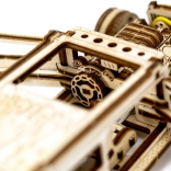 Laser-geschnittenes Birken-Sperrholz, saubere Verbindungen und klebefreier Aufbau. Es genügen einfache Hilfsmittel und das Wachsen der Zahnräder für einen reibungslosen Lauf.