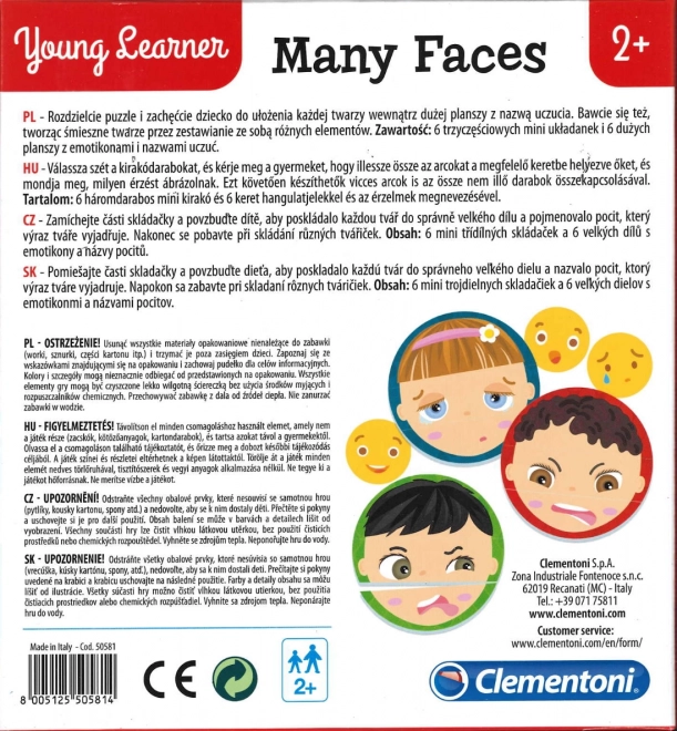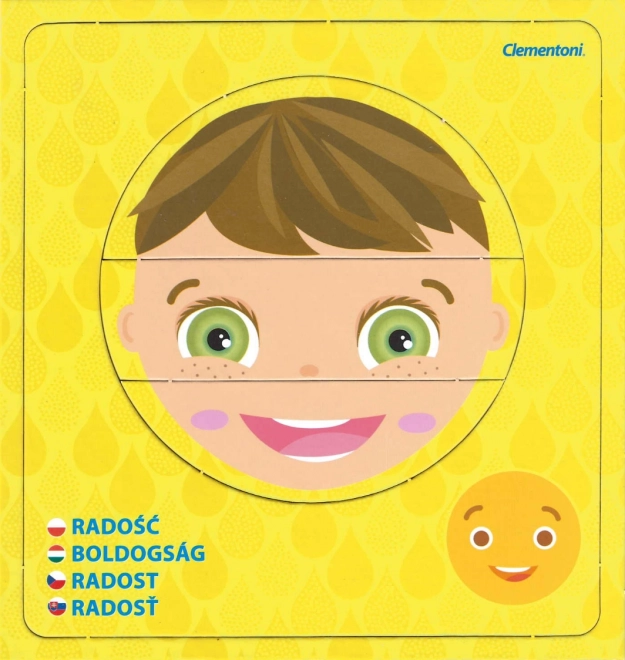 Entdecken Sie die Welt der Emotionen mit dem Kinderpuzzle CLEMENTONI Young Learner. Jedes der 6 Bilder besteht aus 3 Teilen und zeigt eine andere Stimmung mit dem Namen des Gefühls und dem entsprechenden Emoticon. Kinder können die Gesichter einzeln zusammensetzen oder in Rahmen einsetzen und üben so spielerisch das Erkennen von Gesichtsausdrücken.