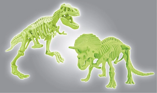 Fluoreszierende Skelettteile absorbieren Tageslicht und strahlen im Dunkeln. Die fertigen Modelle von T‑Rex und Triceratops sind eindrucksvolle Deko und zugleich Lernmaterial.