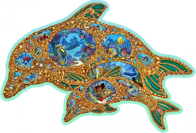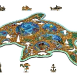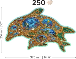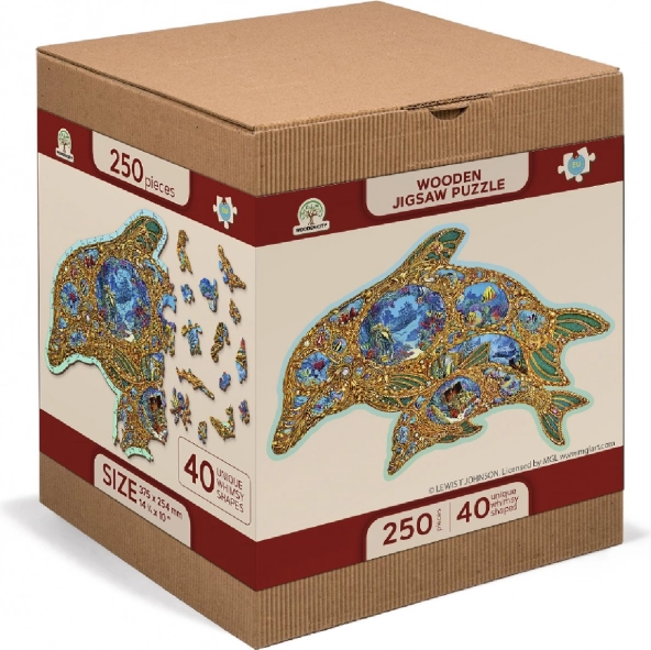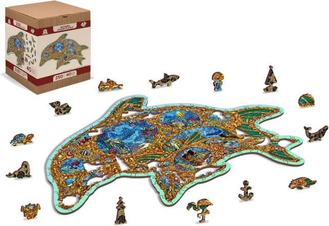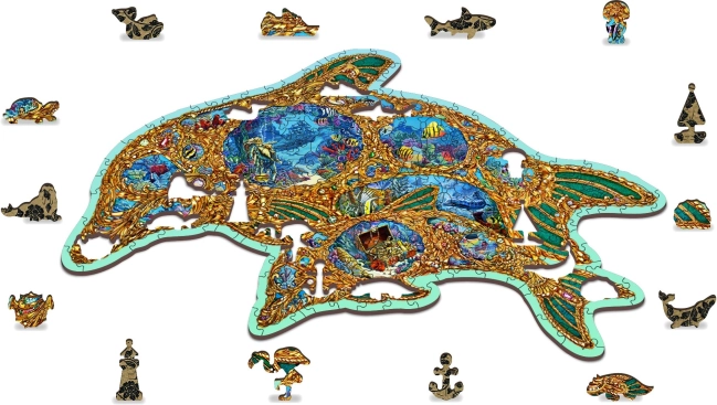 Gönnen Sie sich originellen Puzzle-Spaß mit einem Holzpuzzle in Form eines Delfins, inspiriert von der Unterwasserwelt. Dank speziell geformter Teile – von denen einige Meerestieren nachempfunden sind – ist das Puzzeln visuell attraktiv und zugleich anspruchsvoller als bei klassischen Puzzles. Durch den Laser hervorgehobene Details verleihen dem Motiv Tiefe und einige Teile lassen sich als kleine Figuren aufstellen.