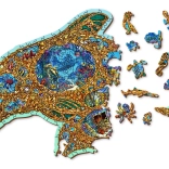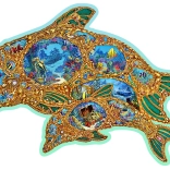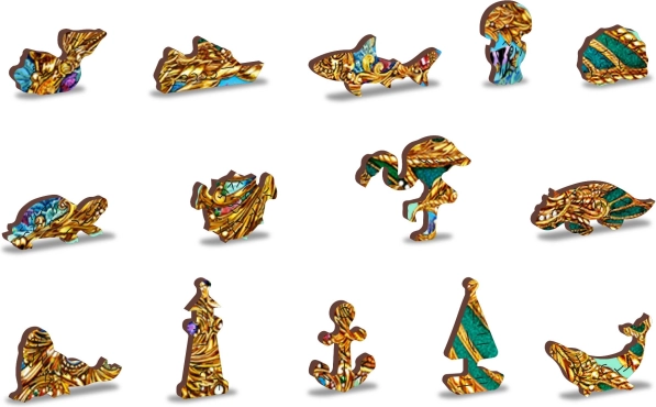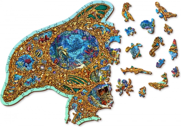 Buntes Unterwasserdesign mit speziellen Teilen in Form von Meerestieren und Pflanzen verleiht dem Puzzeln Originalität und Freude am Entdecken.