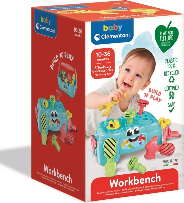 Die kleine Werkbank CLEMENTONI BABY Play for Future ist das ideale Spielzeug für neugierige Kinder, die gerne schrauben, hämmern und die Welt der Werkzeuge entdecken. Die Werkbank lässt sich im Handumdrehen in eine praktische Kiste mit bequemem Griff verwandeln, sodass alle Teile leicht verstaut und überallhin mitgenommen werden können.