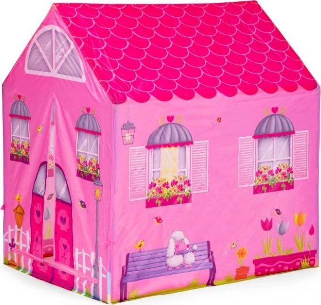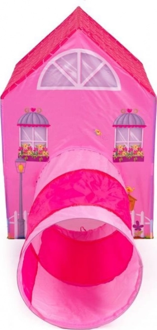 Kinderzelt mit Tunnel im Motiv eines rosafarbenen Häuschens.