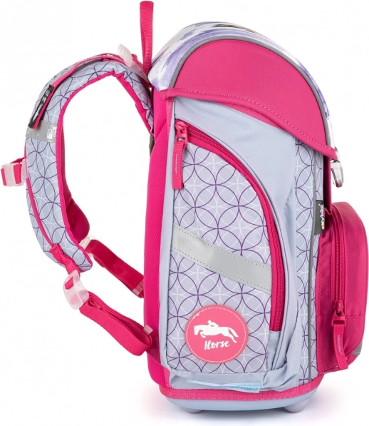 Dieser Schulranzen aus der Premium-Reihe mit dem beliebten Pferde-Motiv ist für maximalen Komfort und eine korrekte Körperhaltung der jüngsten Schulkinder konzipiert. Die anatomisch geformte Rückenpartie mit innerer Verstärkung bewahrt die Form und sorgt zusammen mit der atmungsaktiven Polsterung und den breiten, gepolsterten Trageriemen für einen bequemen, gleichmäßigen Lastverteil.
