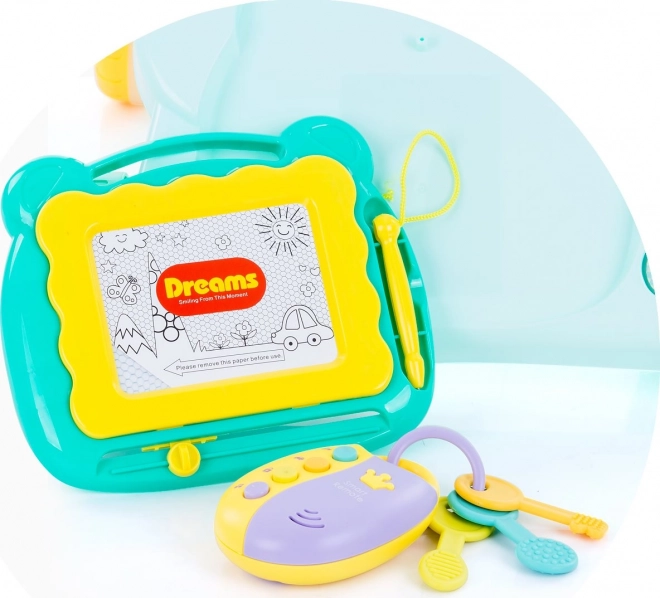 Lichter, Melodien und Geräusche; Zeichentafel mit Stift; Spiegel; Zahnräder; abnehmbare Schlüssel mit Fernbedienung