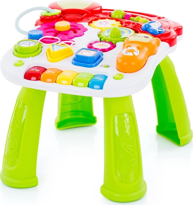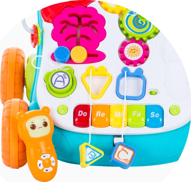 Der Tisch bietet Tasten, Zahnräder und ein Mini-Keyboard mit Noten, die die Feinmotorik, die Hand-Auge-Koordination und das Rhythmusgefühl fördern.