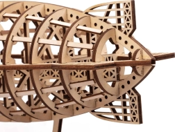 Präzise ausgeschnittene Teile, die zusammengesetzt ein realistisches Modell des Luftschiffs bilden.
