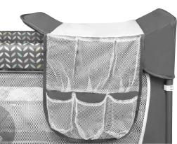 Sicherheit und KomfortLockGuard verhindert ein unbeabsichtigtes Einklappen der Konstruktion, abgerundete Kanten schützen vor Verletzungen und luftdurchlässiges Mesh an den Längsseiten gewährleistet Luftzirkulation und visuellen Kontakt. Die Wickelauflage mit erhöhten Rändern und zwei Taschen hält notwendige Utensilien griffbereit. Eine Spielbogenleiste mit Spielsachen fördert Motorik und Sinne des Kindes.