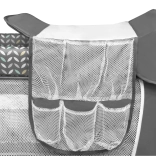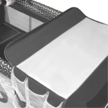 Sicherheit und Komfort – LockGuard verhindert ein unbeabsichtigtes Einklappen der Konstruktion, abgerundete Kanten schützen vor Verletzungen und luftdurchlässiges Mesh an den Längsseiten gewährleistet Luftzirkulation und visuellen Kontakt. Die Wickelauflage mit erhöhten Rändern und zwei Taschen hält notwendige Utensilien griffbereit. Eine Spielbogenleiste mit Spielsachen fördert Motorik und Sinne des Kindes.