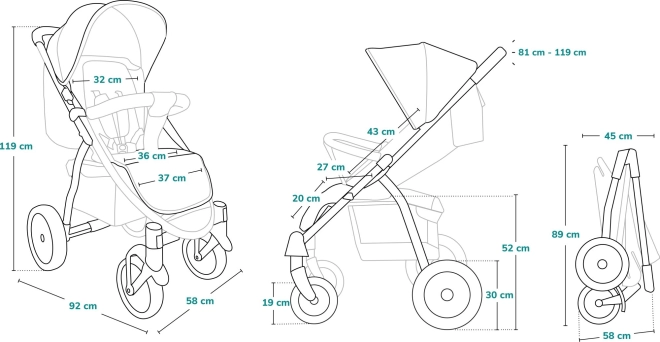 Zur praktischen Ausstattung gehören ein verstellbarer Schieber, ein abnehmbarer Schutzbügel aus Kunstleder, ein geräumiger Einkaufskorb mit 9 kg Traglast sowie eine Tasche im Verdeck. Für Sicherheit sorgen 5-Punkt-Gurte, eine Fußbremse und reflektierende Elemente. Im Lieferumfang enthalten sind ein wärmender Fußsack, ein Getränkehalter und eine Reduziereinlage für Neugeborene – für komfortable Nutzung ab der Geburt.