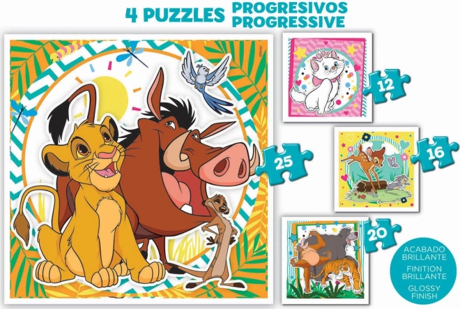 Entdecken Sie ein unterhaltsames Puzzleset mit beliebten Tierchen aus Disney-Märchen. Dank der schrittweise steigenden Anforderungen entwickeln Kinder Feinmotorik, Geduld und logisches Denken. Jedes Bild hat eine unterschiedliche Teileanzahl, sodass kleine Kinder das Puzzeln leicht von einfach bis anspruchsvoller ausprobieren können.