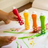 Speziell geformte Fläschchen mit rutschfesten Noppen liegen gut in Kinderhänden und erleichtern erste kreative Versuche ohne Handermüdung.
