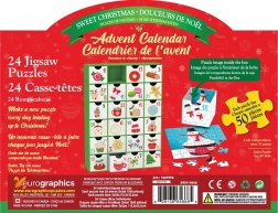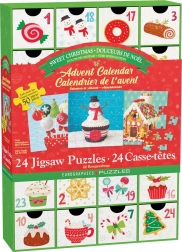 Der EUROGRAPHICS Adventskalender „Süße Weihnachten“ macht den Dezember zur spielerischen Tradition. Jede der 24 Schubladen enthält ein quadratisches Puzzle mit 50 Teilen und köstlichen Süßwarenmotiven. Die Bilder messen 12,5 × 12,5 cm, und die Vorlage ist auf der Rückseite jeder Schublade aufgedruckt, um das Puzzeln zu erleichtern.