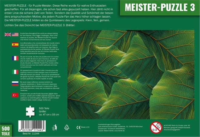 Meister-Puzzle sind für diejenigen geschaffen, die „normale“ Puzzles längst im kleinen Finger haben. Das Motiv Blätter spielt mit feinen Nuancen und wiederkehrenden Formen, sodass das Anlegen jedes Teils sorgfältige Detailbeobachtung und Geduld erfordert.