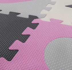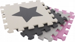 Stilvolle Schaumstoffmatte mit Herz- und Sternmotiven in Rosa und Grau schafft für Kinder ab 3 Jahren einen sicheren und bequemen Spielbereich. Die Teile greifen leicht ineinander, die Matte ist weich, abwaschbar, schalldämpfend und isoliert gegen Kälte. Inklusive Rand- und Eckteile für einen sauberen, abgeschlossenen Abschluss.