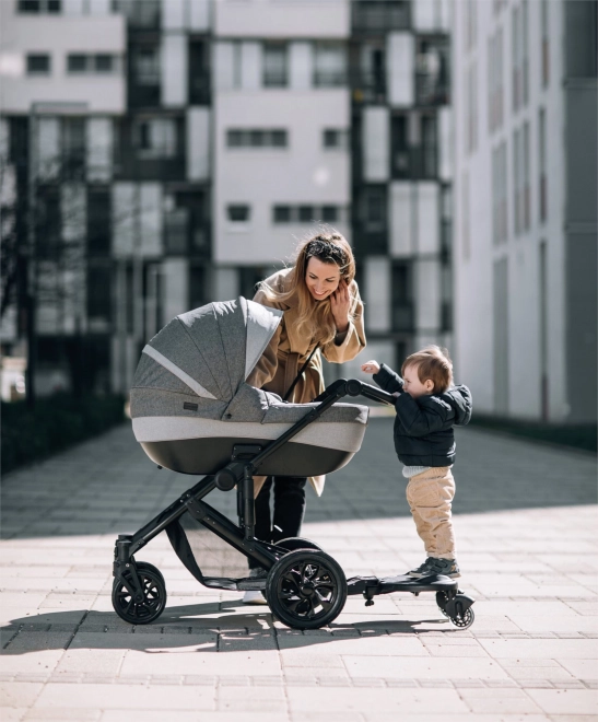 Die Montage ist in wenigen Momenten erledigt – das Befestigungssystem ist robust und zugleich schnell und mit den meisten europäischen Kinderwagen kompatibel. Zwei widerstandsfähige Schwenkräder mit 11,5 cm Durchmesser gewährleisten Stabilität und eine sanfte Bewegung in der Stadt und im Park. Die praktische Klappfunktion spart Platz, wenn das Mitfahrbrett gerade nicht genutzt wird.