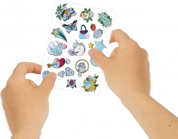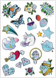 Das Set Crazy Chic Glitzernde Tattoos enthält eine breite Palette von Designs, darunter Einhörner, Schmetterlinge und andere Motive. Die Tattoos sind einfach anzuwenden und dermatologisch getestet.