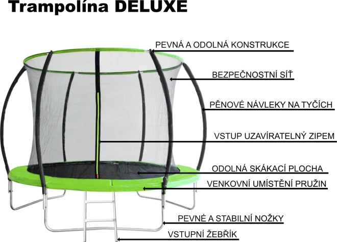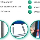 Der robuste Rahmen aus verzinktem Stahl, die PP-Sprungmatte und das hochwertige PE-Netz gewährleisten Wetterbeständigkeit und langfristige Zuverlässigkeit. Enthalten ist eine Metallleiter für den bequemen Einstieg sowie elliptische Stangen mit Schaumpolsterung für zusätzliche Netzstabilität.