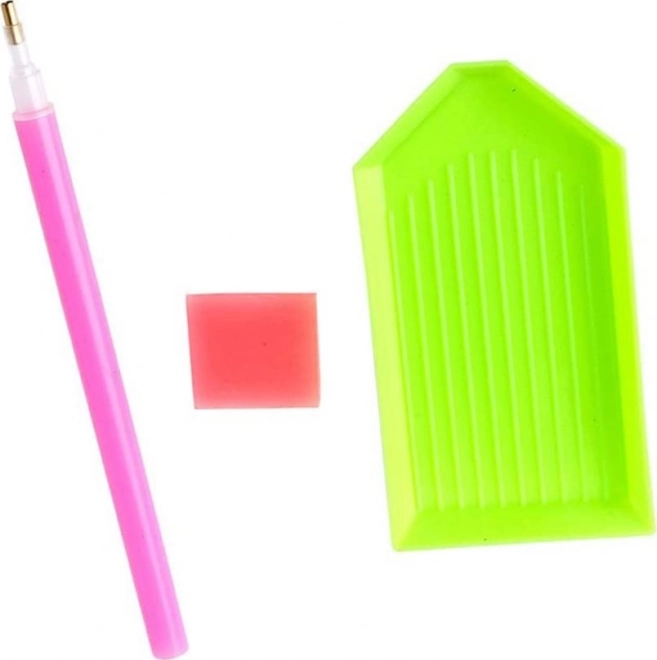 Lieferumfang: Leinwand mit vorgedrucktem Motiv, Stift zum Aufnehmen der Steinchen, Schälchen zum Ausschütten der Steinchen, Klebewachs, Set farbiger Steinchen.