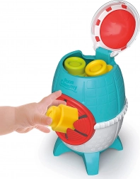 Das Raketen-Design mit Deckel und seitlicher Öffnung macht die Box zu einem cleveren Spielzeug und praktischen Aufbewahrungsort. Kinder trainieren Einwerfen, Herausnehmen und die Hand‑Augen‑Koordination.