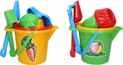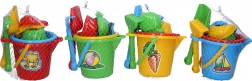 Dieses kompakte Sandset bietet alles, was kleine Kinder für kreatives Spielen im Freien benötigen. Der Eimer mit Ausgießer erleichtert das Eingießen von Wasser und das Bauen von Burgen, während Sieb, Harke und Schaufel Motorik und Fantasie fördern.