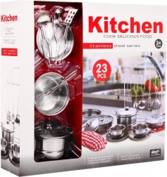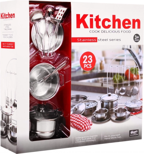 Dieses 23-teilige Küchenset für Kinder bietet eine großartige Gelegenheit für kreatives Rollenspiel. Das Set enthält echtes Metallgeschirr und ein textil Chefkoch-Kostüm, das die Fantasie und Entwicklung praktischer Fähigkeiten fördert. Es ist für Kinder ab 3 Jahren geeignet und garantiert stundenlangen Spaß.