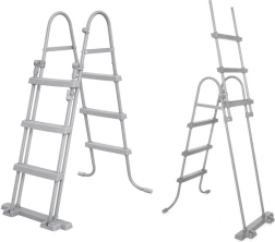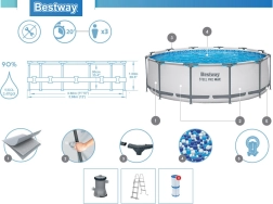 Enthalten sind eine Filterpumpe mit Kartusche Typ II, Schläuche und Klemmen, Siebe, Verschlusskappen, ein Reparaturflicken sowie eine sichere abnehmbare Leiter.