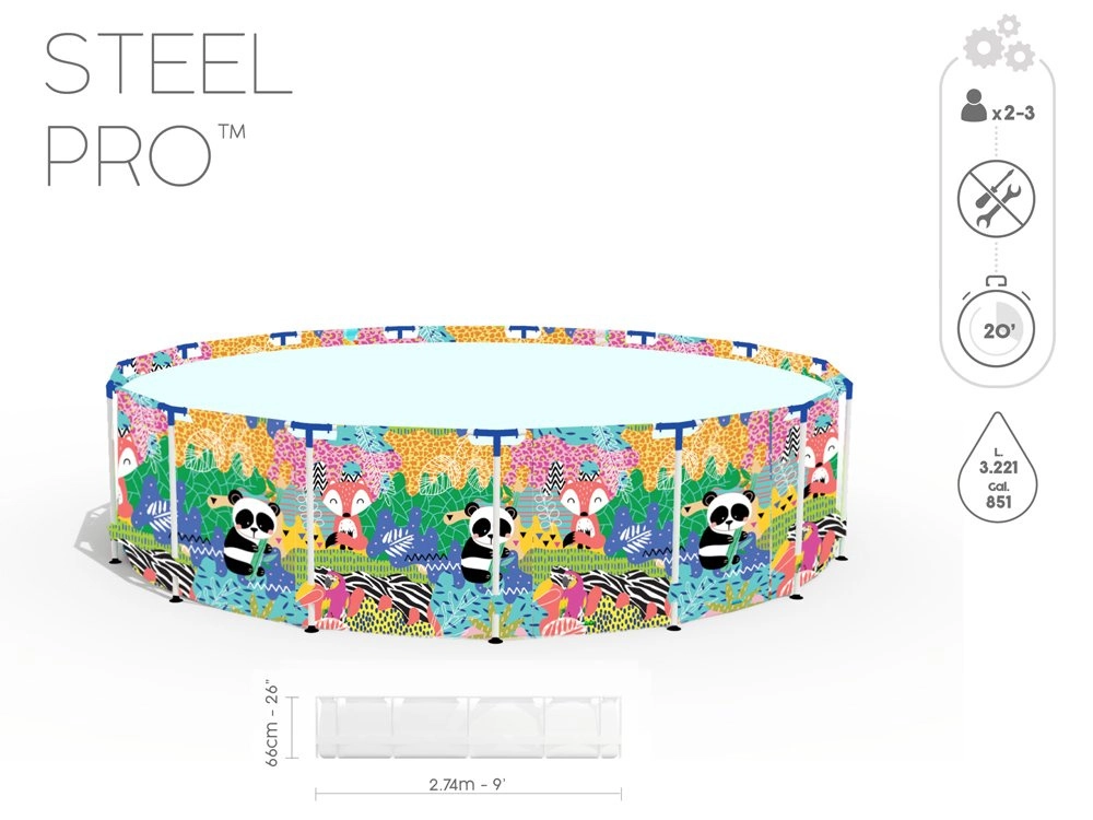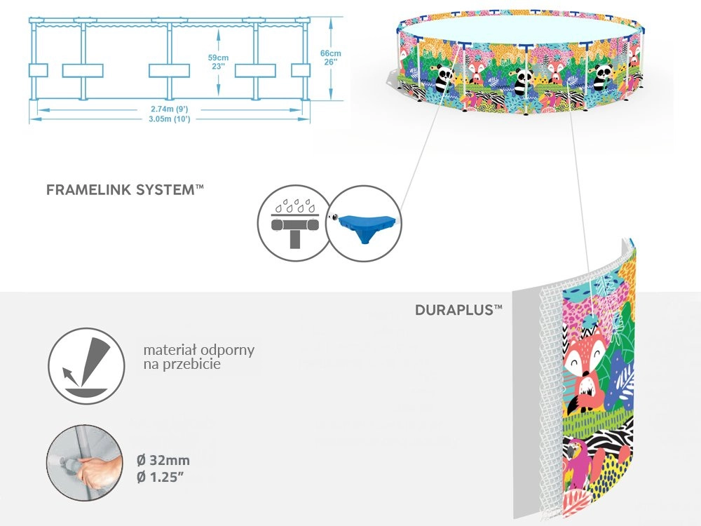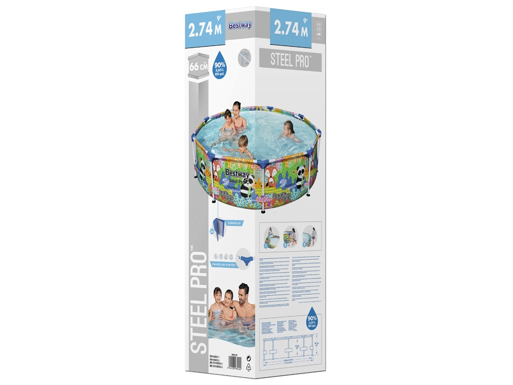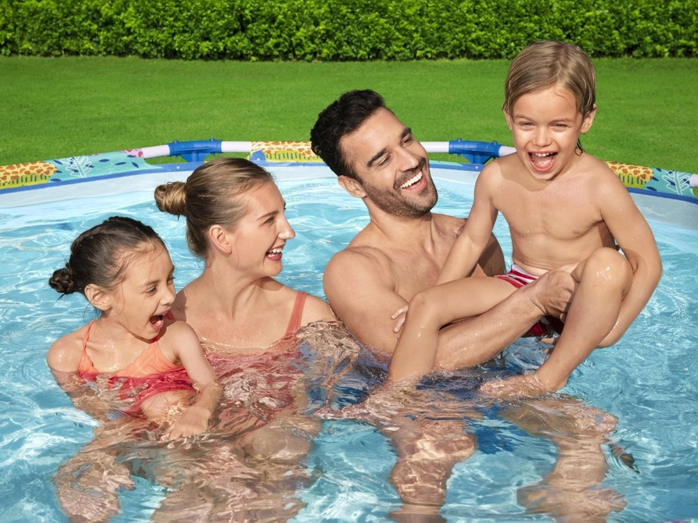 Die ideale Wahl für kleinere Gärten, Höfe oder Terrassen: Der runde Rahmenpool von BESTWAY mit einfacher Montage bringt Erfrischung und jede Menge Spaß für Kinder und Eltern. Der stabile Stahlrahmen und die hochwertigen, weichen Wände mit fröhlicher Tiergrafik schaffen eine sichere Umgebung für Wasserspiele.