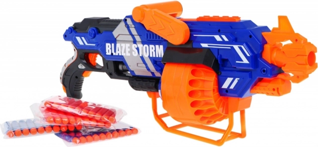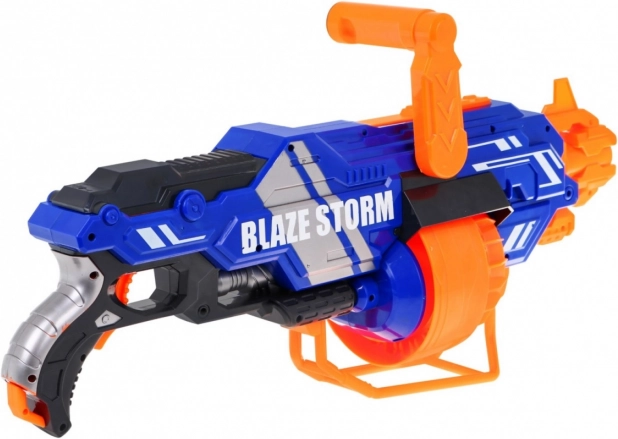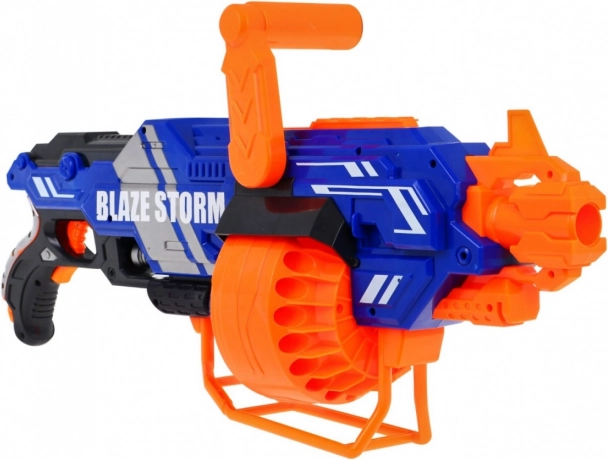 Der BLAZE STORM Blaster ist ein einfach zu bedienendes Spielzeug für dynamische Action drinnen und draußen. Einfach Batterien einsetzen (8× AA 1,5 V, nicht enthalten), das Trommelmagazin füllen, die Powertaste halten und den Abzug drücken. Du kannst je nach Dauer des Abzugs zwischen Einzelschüssen und Dauerfeuer wählen.