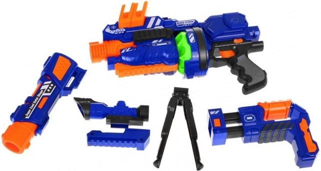 Die modulare Kinder-Spielzeugpistole Blaze Storm bietet actionreichen, aber sicheren Spaß drinnen wie draußen. Der elektrische Halbautomat mit Trommelmechanismus und Magazin ermöglicht schnelle Einzelschüsse und kurze Serien, während die Schaumkugeln weich und schonend sind. Dank Stirnband/Visier, Stabilisator und der Option einer Laufverlängerung lernen Kinder präzises Zielen und können verschiedene Spielszenarien gestalten.