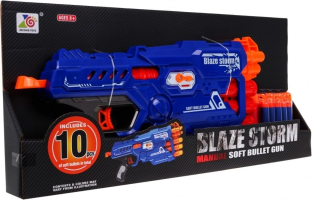 Der Blaster BLAZE STORM ist eine hervorragende Wahl für sicheres und spannendes Spielen. Dank des manuellen Spannmechanismus ist die Bedienung einfach und zuverlässig – laden Sie die Pfeile in die 6 Läufe, spannen und drücken Sie den Abzug. Mit dem Modusschalter wählen Sie, ob Sie kleinere blaue oder größere rote Geschosse abfeuern.