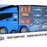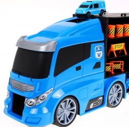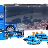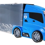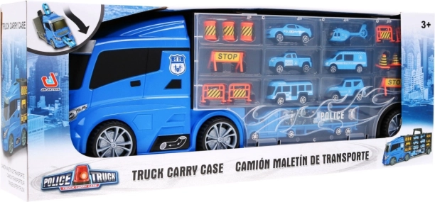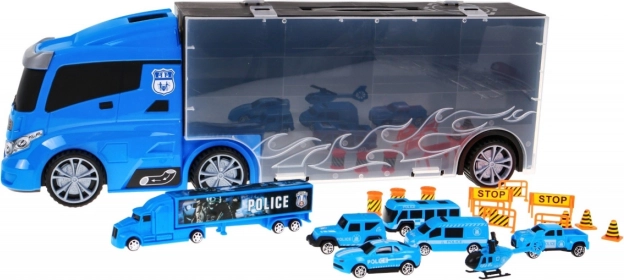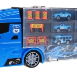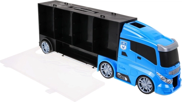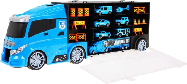 Entdecken Sie den multifunktionalen Polizei-LKW, der sowohl als praktischer Organizer für Spielautos als auch als tolles Spielset dient. An den Seiten befinden sich zwei aufklappbare Stauräume – auf der einen Seite 13 kleinere Fächer, auf der anderen 5 größere. Über der Kabine liegt der Einstieg zur Rutschbahn, die durch die Kabine führt und an der Front des Fahrzeugs endet. Die obere Fläche des LKW dient als „Flughafen“ für den Hubschrauber. Dank des bequemen Tragegriffs können Kinder das Set überallhin mitnehmen.