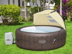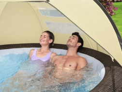 Die Überdachung bietet Schutz vor UV-Strahlung und Wind und sorgt so für ein angenehmes Badeerlebnis bei jedem Wetter.