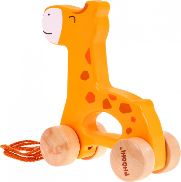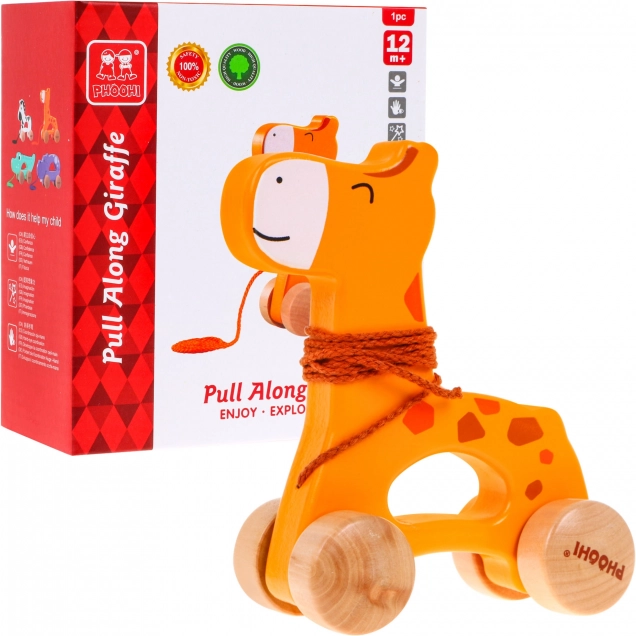 Holzrädchen und eine einfache Schnur ermöglichen es Kindern, die Giraffe problemlos über verschiedene Oberflächen zu ziehen.