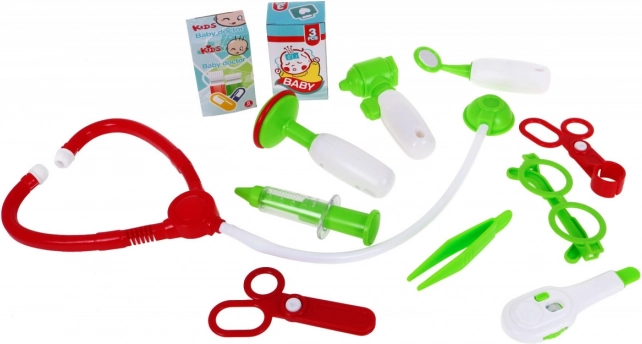 Enthalten ist alles, was kleine Ärzte brauchen: Stethoskop, Brille, zwei Scheren (auch mit abgerundeter Spitze), Pinzette, Spritze, Thermometer, Schachtel mit Pflastern und Kompressen, Untersuchungs-Spiegel, Untersuchungs-Aufsatz, Hämmerchen und Aufkleber. Das Spiel hilft, Arztängste abzubauen, fördert soziale Fähigkeiten und die Vorstellungskraft.