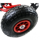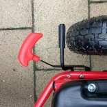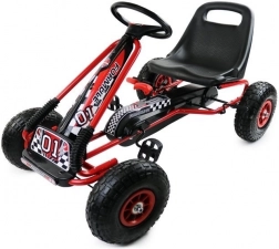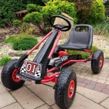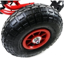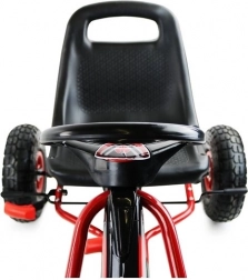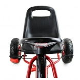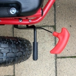 Dank der breiten Luftreifen mit markantem Profil meistert der Gokart Pflaster, Garten und Parkwege. Die Handbremse, die auf beide Hinterräder wirkt, gibt Sicherheit bei Gefälle, während die abgedeckte Kette und rutschfeste Pedale die Sicherheit erhöhen. Eine hochwertige Lackierung schützt vor Kratzern und Witterung.