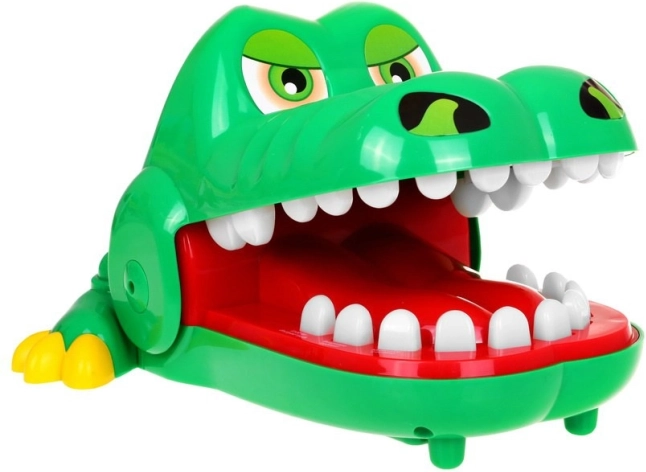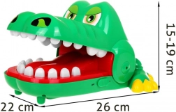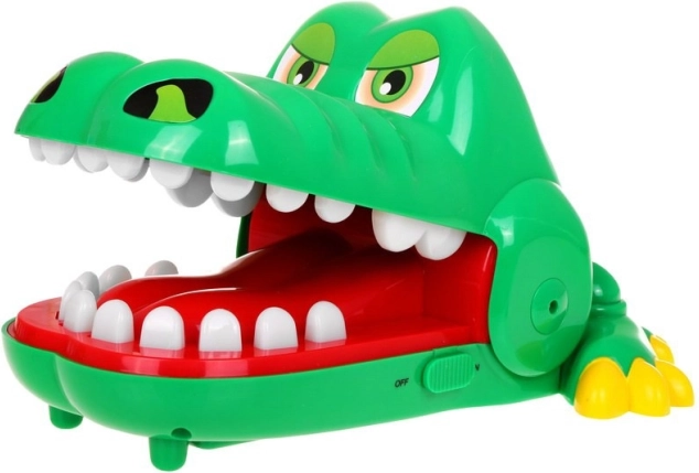 | Das Krokodil öffnet mutig sein Maul und wir sehen eine Reihe schöner, gerader Zähne – leider ist einer davon schmerzhaft. Dafür drücken wir mit dem Finger nacheinander auf einen beliebigen Zahn (bei mehreren Spielern reihum). 3 SPIELVARIANTEN: 1. SCHMERZHAFTER ZAHN - roter Knopf – aktiviert die erste Spielvariante. - nach dem Drücken starten wir das Spiel: Wir drücken Zahn für Zahn ... Wenn du den schmerzenden Zahn erwischst, beißt dich das Krokodil! Das bedeutet Niederlage. 2. REAKTIONSSPIEL: - drücke den Zahn, der orange leuchtet, - drücke schnell die Zähne, die nach und nach aufleuchten, die Geschwindigkeit des Aufleuchtens nimmt zu, - wenn zwei Zähne gleichzeitig leuchten, versuche sie so schnell wie möglich nacheinander zu drücken, - wenn du dreimal falsch drückst, schließt das Krokodil sein Maul, du hast verloren, das Spiel endet. - am Ende des Spiels entspricht die Anzahl der leuchtenden Zähne deinem Reflexniveau. 3) GEDÄCHTNIS: - drücke den grün leuchtenden Zahn, - merke dir die leuchtenden Zähne, - wenn das Krokodil fragt „Welcher Zahn tut weh?“, drücke die gemerkten Zähne, - du kannst es erneut versuchen, wenn deine Antwort richtig ist, - die Anzahl der leuchtenden Zähne wird steigen und die Leuchtdauer wird immer kürzer. - wenn du falsch antwortest, schließt das Krokodil sein Maul und beißt dir in den Finger. | ||