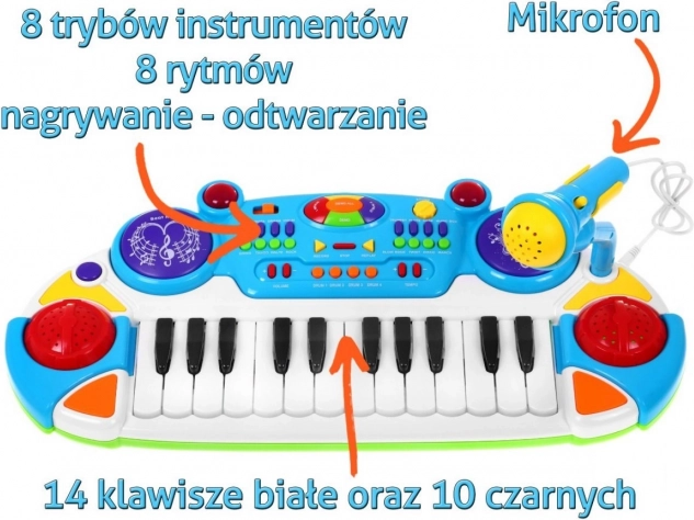 Blaues Musikset mit Tasten und Mikrofon für Kinder ab 3 Jahren Lichter und Klänge 2 Oktaven
