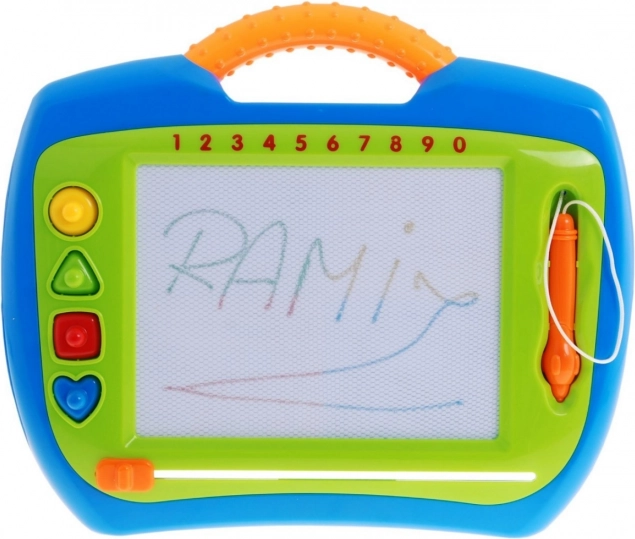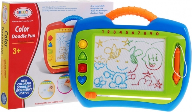 Diese magnetische Maltafel unterstützt Kreativität, Feinmotorik und Konzentration. Die Zeichenfläche hat vier farbige Sektoren (gelb, blau, rot, grün), wodurch Bilder lebendig wirken und Kinder ganz natürlich Farb- und Formerkennung üben. Der Stylus ist an einer Schnur befestigt, damit er nicht verloren geht, und der Schieber unter der Zeichenfläche löscht alles mit einem Zug.